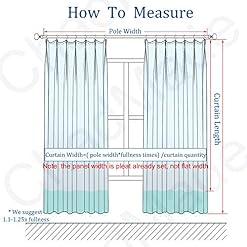 5.5″ pleat space apart. Height adjustable pin hooks included. Pinch pleated header fit for track or traverse rod with rings. Measure the length from ring of track or rod.