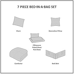 Set Includes: 1 Comforter, 1 Standard Sham, 1 Bed Skirt, 1 Flat Sheet, 1 Fitted Sheet, 1 Pillowcase, 1 Decorative Pillow