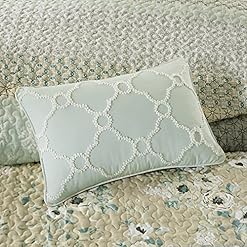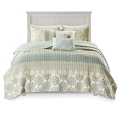 For a clean, cottage feel in your bedroom, Madison Park Willa provides a mix of shabby chic with modern prints. Stripes feature florals, medallions, and geometric designs in green and shades of yellow and taupe. Two shams pull the floral design from the coverlet and three decorative pillows use coordinating colors to complete this look.