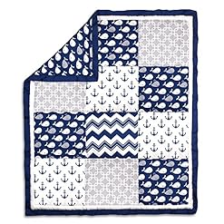 100% cotton sateen fabrics highlight this premium quality patchwork of navy blue and grey nautical prints including whales, chevrons, anchors, and geometrics; 4 piece set includes reversible quilt, whale print fitted sheet, sealife digital musical mobile, and tailored dust ruffle; individual components of this set are also available for purchase separately