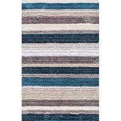 A stunning array of colors mixed into this striped pattern gives a designer look and feel and makes a statement in any room. Colors include tan, brown, ivory, grey, and blue