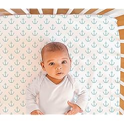 Soft fitted crib sheet, 52 x 28 to fit a typical crib mattress, features a navy anchor theme during the soft fabric and includes throughout elastic for a protected and snug fit